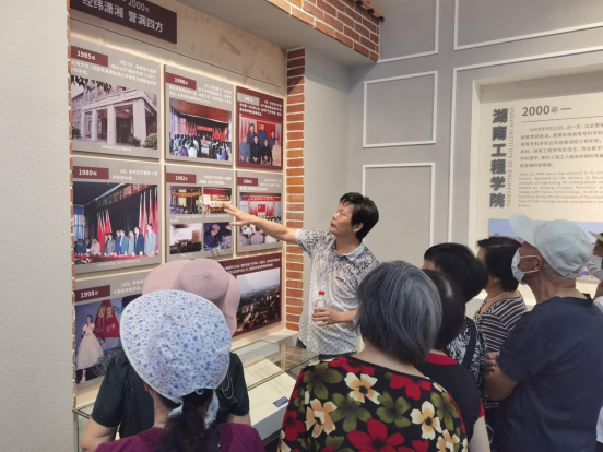 “你看,这是我年轻的时候。”“孙老师,这是你之前的工作照。”校史馆内丰富的图文信息和实物,展示着学校各个时期的突出成就和湖工人的精神风貌。每一个展柜、每一幅照片、每一张奖状、每一件实物都让老同志们驻足良久。在讲解员的讲解和带领下,老同志们重温了我校的历史沿革。在参观到学校的前身湘潭机电高等专科学校和纺织高等专科学校的展板时,老同志们停留许久,勾起了大家对往事的深情回忆,校史馆凌毅为老同志们讲解两校的发展历史。大家在老照片中寻找熟悉的场景和面孔,这些老照片唤醒了老同志们内心深处的记忆,他们把自己的青春和最好的年华奉献在湖工,培养了一代又一代的年青学子。时光荏苒,传道授业的时光仿佛就在昨日,而他们对学校的热爱也一如既往,从未改变。在展板前,他们纷纷拿出手机拍照留念,把美好的奋斗青春永远珍藏。