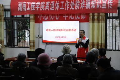 4月15日,“我为您的钱袋子保驾护航”老年人防诈骗知识宣讲活动在北校区老年活动室举行。本次活动由离退休工作处主办,宝塔街道盘龙社区、湘潭市仁与社会工作服务中心协办。学校北校区退休老同志和家属共计200余人参加了本次活动。